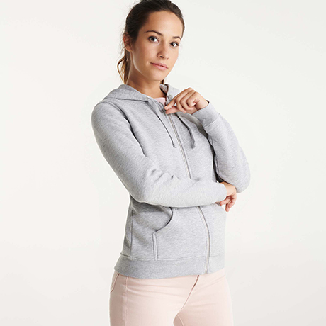 Casaco feminino em pelúcia, com capuz forrado no mesmo tom.